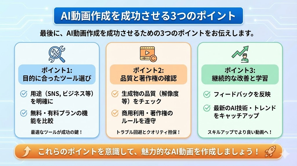 最後に、AI動画作成を成功させるための3つのポイントをお伝えします。