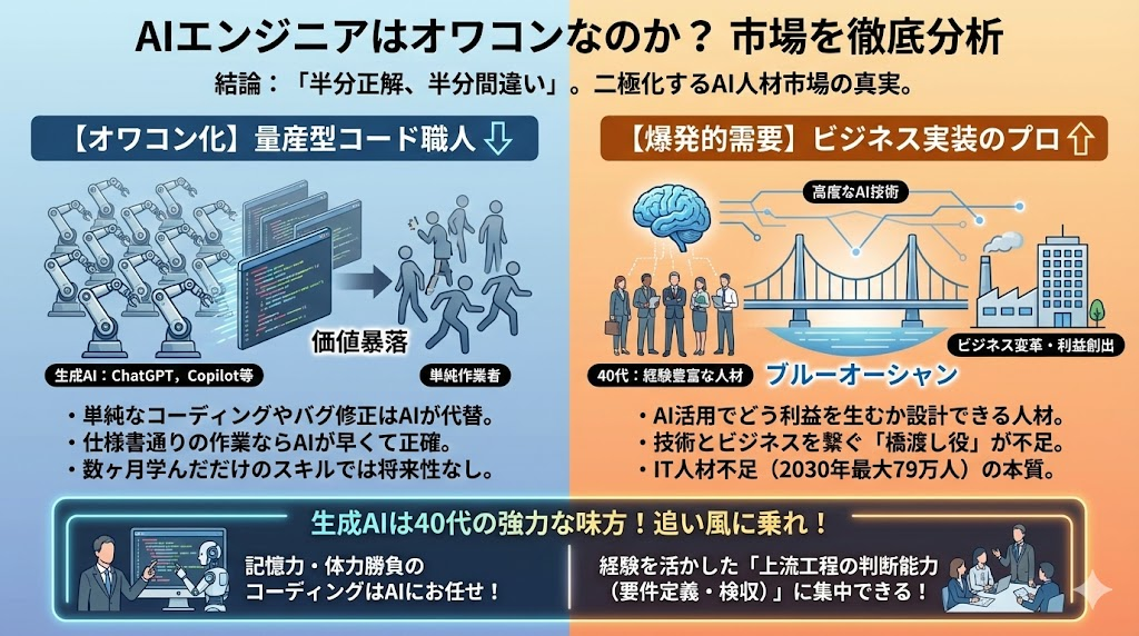 次に、「AIエンジニアはもうオワコン(終わったコンテンツ)だ」という極端な意見について分析してみましょう。結論から言うと、これは「半分正解で、半分間違い」です。