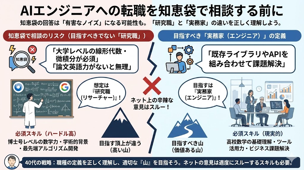 実務レベルであれば、高校数学の基礎的な理解(行列の意味や統計の基礎など)と、ツールを使いこなす力があれば十分に戦えます。「数学の壁」に怯えて諦める前に、自分が目指すべき職種の定義を正しく理解することが重要です。ネット上の辛辣な意見は、「目指す山の頂上が違う人の意見」として、適度にスルーするスキルも40代には求められます。