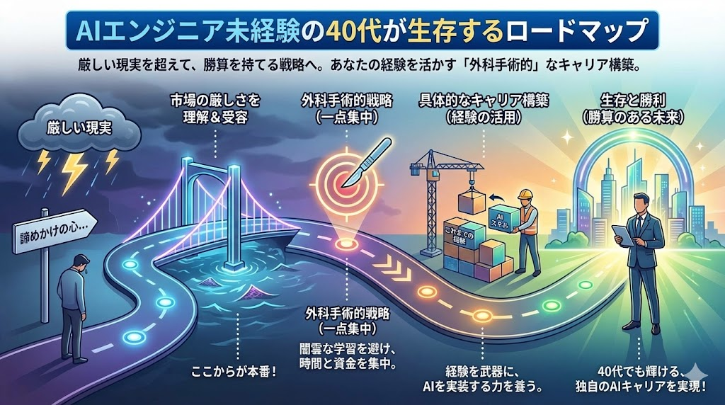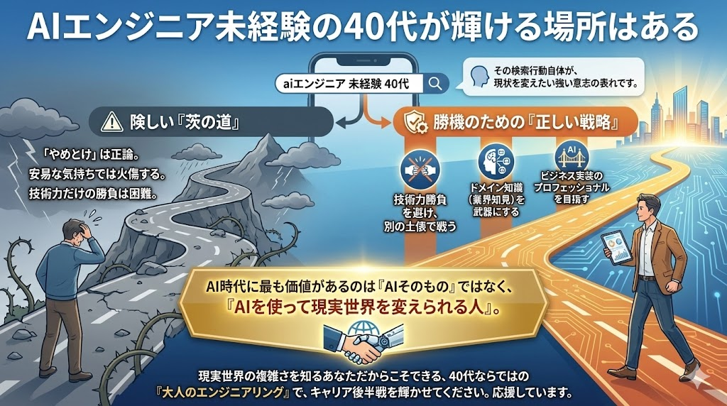 確かに、40代未経験からのAIエンジニア転身は、茨の道です。「やめとけ」という声は正論であり、安易な気持ちで挑めば火傷をするでしょう。しかし、正しい戦略――すなわち、技術力勝負を避け、ドメイン知識を武器にし、ビジネス実装のプロフェッショナルを目指す戦略――を取れば、勝機は十分にあります。