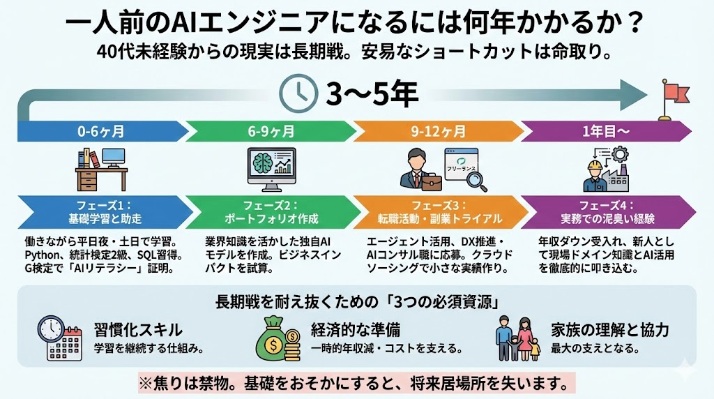 40代未経験からスタートする場合、現実はもっと長期戦です。基礎学習に半年、何らかの形で実務に入ってからまともに戦力になるまでに1〜2年、そして「一人前」として自走し、市場価値が安定するには通算で3〜5年かかると見積もっておくべきです。