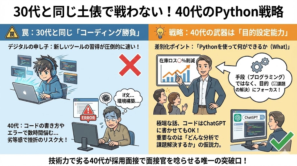 学習を始めると、どうしても「Pythonの文法を覚えること」や「コードを速く書くこと」に固執してしまいがちです。しかし、ここでPython未経験の20代・30代と同じ土俵で「コーディング勝負」を挑むのは得策ではありません。