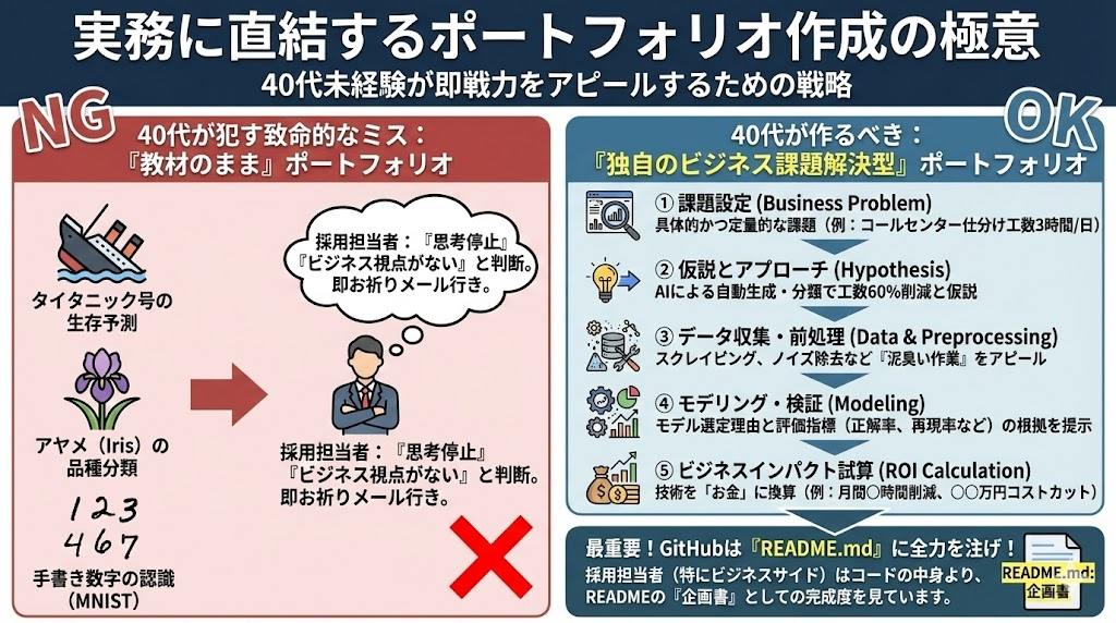 未経験からの転職活動において、職務経歴書以上にあなたの実力を証明するのが「ポートフォリオ(作品集)」です。しかし、ここで多くの40代が致命的なミスを犯しています。それは、ネット上の教材やスクールの課題で作った「タイタニック号の生存予測」や「アヤメ(Iris)の品種分類」、「手書き数字の認識(MNIST)」をそのままポートフォリオとして提出してしまうことです。