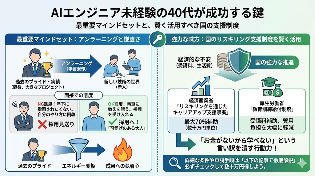 最後に、40代がAIエンジニアへの転身を成功させるための最も重要な「マインドセット」についてお話しします。それは、「アンラーニング(学習棄却)」と「謙虚さ」です。