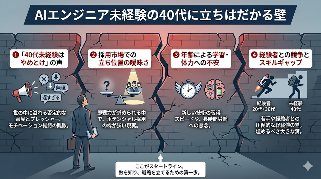 「40代から未経験でAIエンジニアなんて、正直無謀だろうか?」「ネットで検索すると『やめとけ』という言葉ばかりで、心が折れそうになる……」