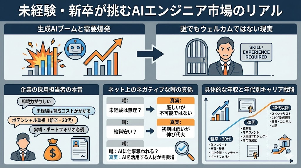 まずは、AIエンジニアを目指す未経験の新卒が直面する、リアルな市場環境についてお話しします。生成AIブームで需要は爆発していますが、誰でもウェルカムというわけではありません。企業の採用担当者が今、何を考えているのか、そしてネット上のネガティブな噂の真偽や、具体的な年収、年代別のキャリア戦略について、綺麗事抜きで深掘りしていきますね。