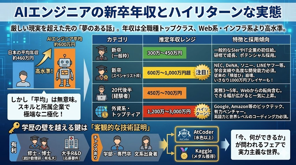 | 外資系・トップティア | 1,200万〜3,000万円 | Google, Amazon等のビックテックや有力AIベンチャー。英語力と世界レベルのコーディング力が必須。 |