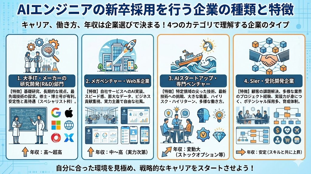 「AIエンジニアになりたい!」と思っても、どの企業に入るかでその後のキャリアや働き方、そして年収は大きく変わります。就職活動や転職活動では、企業のタイプごとの特徴をしっかり理解しておくことが重要です。ここでは大きく4つのカテゴリに分けて解説します。