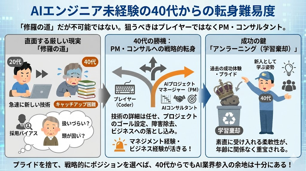 40代未経験からのAIエンジニア転身。正直に申し上げますと、これは「修羅の道」です。20代の若手エンジニアが数日で習得する新技術を、同じスピードでキャッチアップし続けなければならない。しかも、年下の上司から指示を受け、素直に修正できるかどうかも問われます。採用企業側も、「扱いづらいのではないか」「頭が固いのではないか」というバイアスを持って見てくるのが現実です。