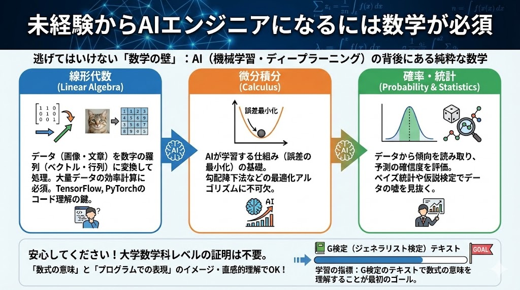 なぜなら、AI(特に機械学習やディープラーニング)の背後にあるのは、純粋な数学だからです。モデルの挙動を理解し、適切なパラメータ調整やトラブルシューティングを行うには、以下の3つの分野の知識がどうしても必要になります。