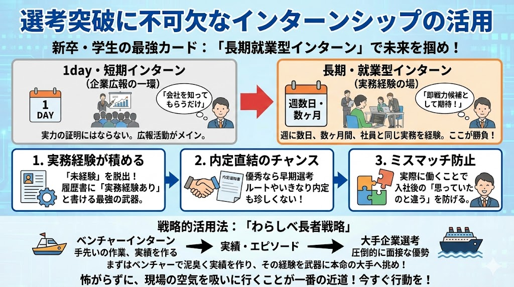 「いきなり大手企業のインターンはハードルが高い…」という場合は、まずはベンチャー企業のインターンに飛び込んでみてください。そこで泥臭く手を動かして実績を作り、その経験をエピソードトークとして話せるようになれば、本命の大手企業の選考でも圧倒的に有利になります。いわゆる「わらしべ長者戦略」ですね。怖がらずに、まずは現場の空気を吸いに行くことが、内定への一番の近道ですよ。