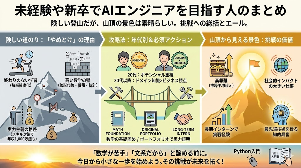 AIエンジニアへの道は決して楽なピクニックではありません。険しい登山のようなものです。しかし、その山頂から見える景色――市場平均を大きく上回る報酬、社会的インパクトの大きい仕事、そして最先端技術を操る知的な興奮――は、何物にも代えがたい魅力があります。