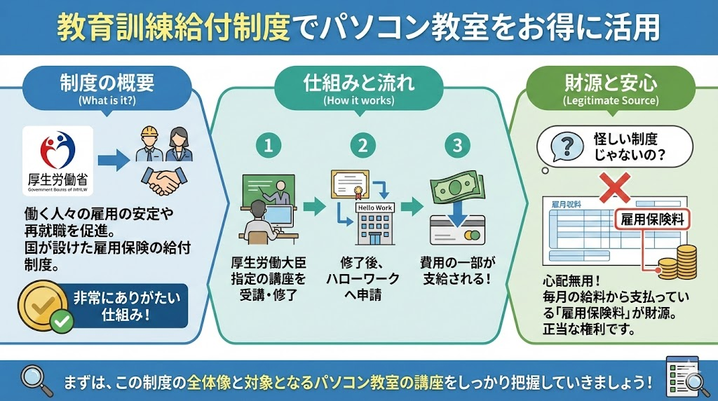 「何か怪しい制度なんじゃないの?」と心配する必要は全くありません。これはあなたが毎月の給料から支払っている「雇用保険料」を財源としている正当な権利なんです。まずは、この制度がどのような仕組みで、具体的にどんなパソコン教室の講座が対象になっているのか、その全体像からしっかりと把握していきましょう。