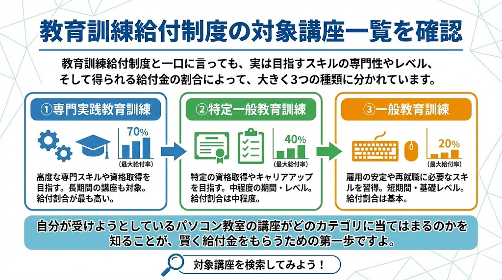 教育訓練給付制度と一口に言っても、実は目指すスキルの専門性やレベル、そして得られる給付金の割合によって、大きく3つの種類に分かれています。自分が受けようとしているパソコン教室の講座がどのカテゴリに当てはまるのかを知ることが、賢く給付金をもらうための第一歩ですよ。