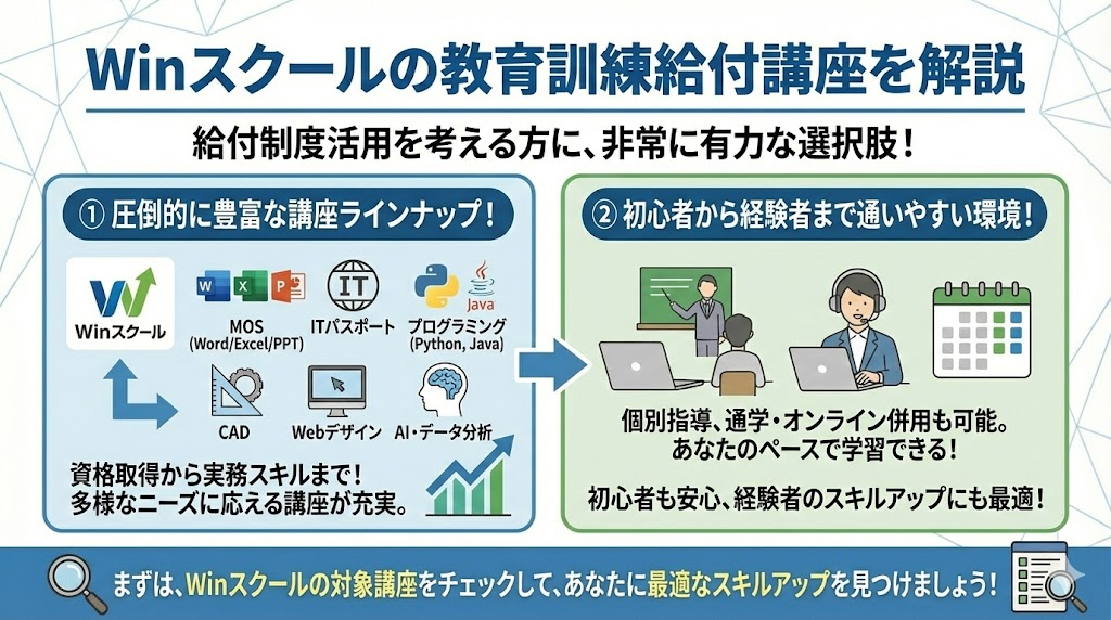 - Winスクールやハロー!パソコン教室などで実際に給付金を使う方法がわかる