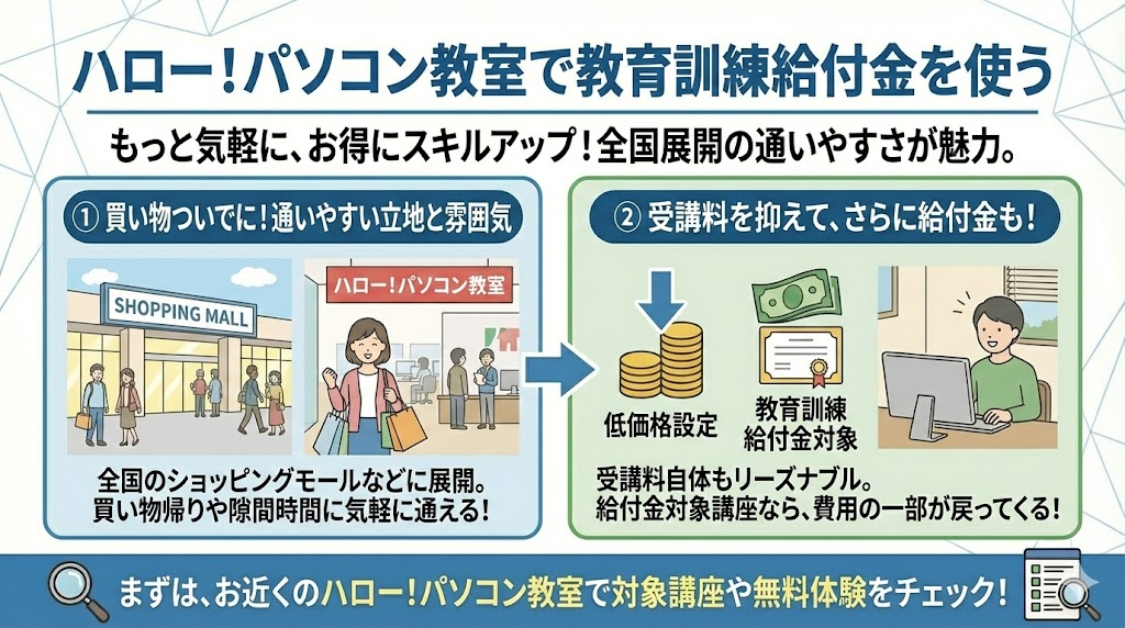 高度なプログラミングやAIを学ぶというよりは、「事務職への再就職のために必須のOfficeスキルを固めたい」「履歴書に書ける資格を一つでも持っておきたい」という主婦層やシニア層の方にとって、ハロー!パソコン教室での給付金活用は非常に現実的で効果的な手段と言えます。