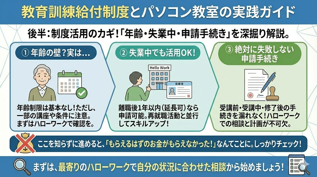 前半では、制度の仕組みや具体的なスクールの選び方についてお話ししてきました。ここからは、実際に制度を利用しようと思ったときにぶつかる「年齢の壁」や「失業中の活用法」、そして「絶対に失敗しない申請手続き」について、さらに深掘りしていきましょう。