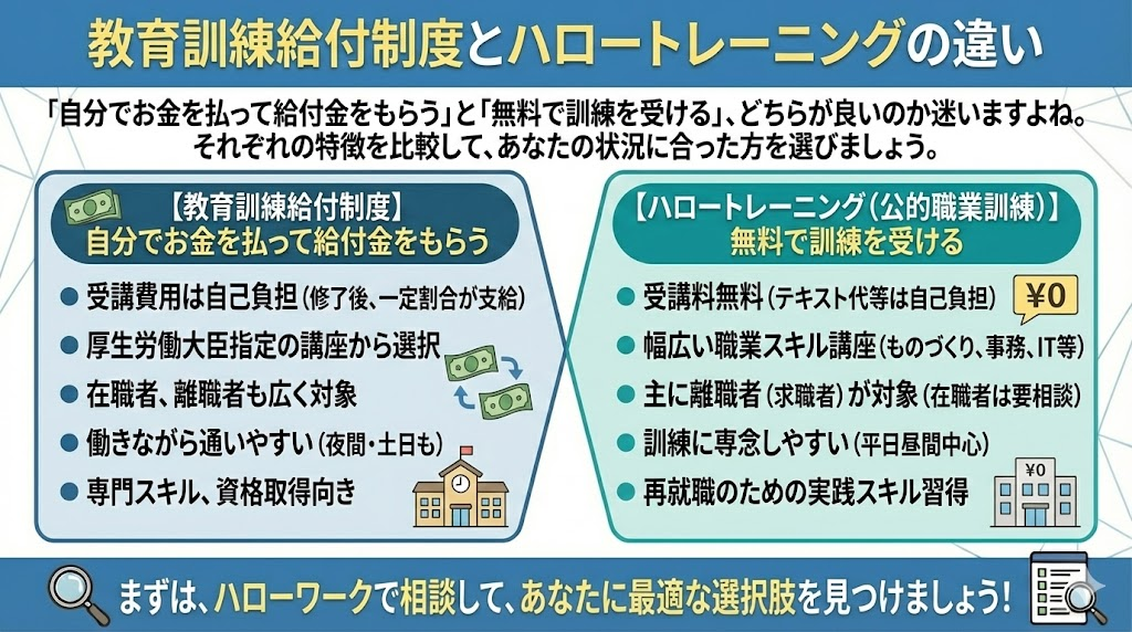 「自分でお金を払って給付金をもらう(教育訓練給付制度)」のと、「無料で訓練を受ける(ハロートレーニング)」の、どちらが良いのか迷いますよね。それぞれの特徴を比較して、あなたの状況に合った方を選びましょう。