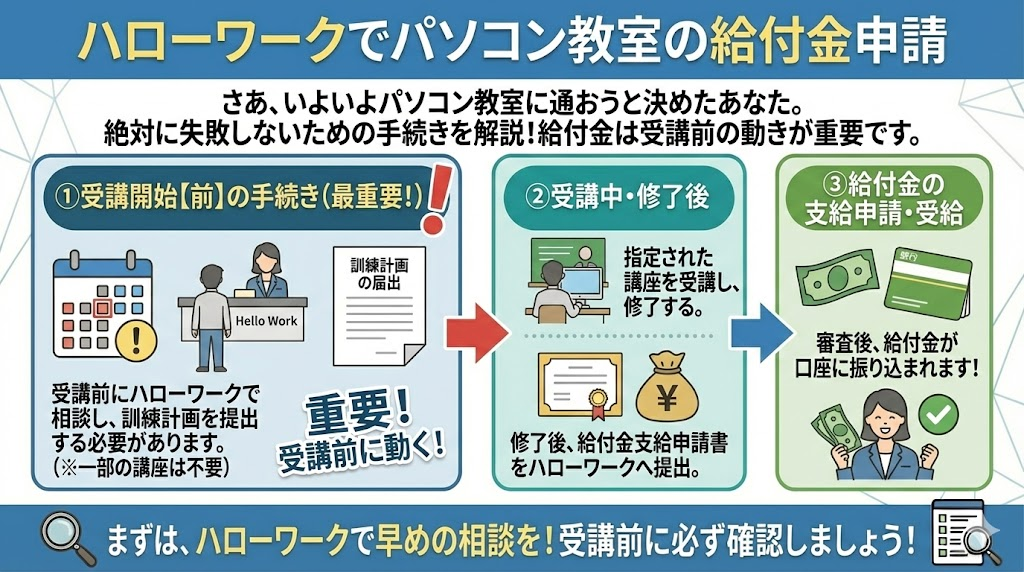 さあ、いよいよパソコン教室に通おうと決めたあなた。ここで絶対に失敗しないための手続きについて解説します。給付金をもらうためには、受講が終わってからではなく、受講が始まる前に動く必要があるケースが多いんです。