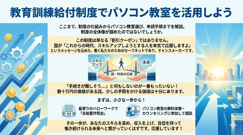 ここまで、教育訓練給付制度の仕組みから、パソコン教室選びのポイント、そして具体的な申請手順までを詳しく解説してきました。少し長い説明になりましたが、制度の全体像が掴めたのではないでしょうか。