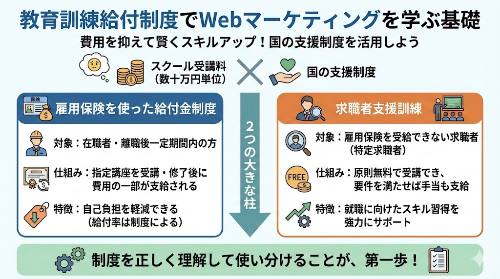 Webマーケティングのスキルを身につけたいけれど、スクールの受講料が高くて躊躇しているという方は多いはずです。専門的なスクールに通うとなると、数十万円単位の費用がかかることも珍しくありませんから、二の足を踏んでしまうのも無理はありません。そんなときに頼りになるのが、国が用意してくれているさまざまな支援制度ですよ。ここではまず、雇用保険を使った給付金制度と、求職者支援訓練という2つの大きな柱について、その仕組みや特徴を整理していきましょう。制度を正しく理解して使い分けることが、費用を抑えて賢くスキルアップする第一歩になります。