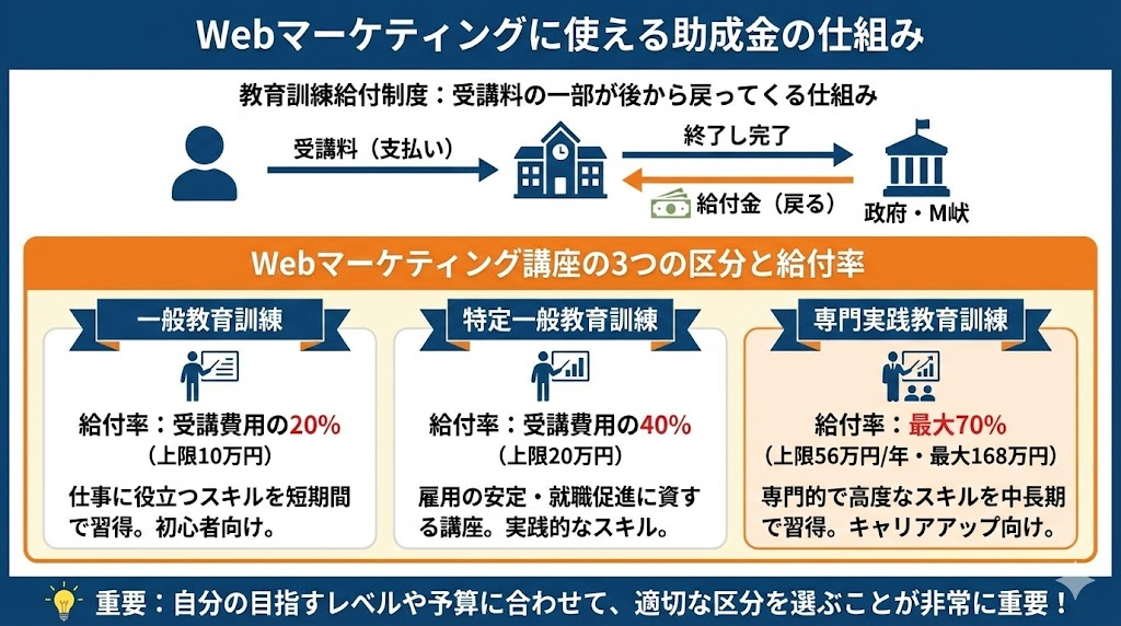 まず押さえておきたいのが、厚生労働省が管轄する「教育訓練給付制度」です。これは、あなたが支払った受講料の一部が後から戻ってくるという仕組みですね。Webマーケティング分野の講座は、大きく分けて3つの区分に分類されており、どの区分に該当するかによって戻ってくる金額が大きく異なります。自分の目指すレベルや予算に合わせて、適切な区分を選ぶことが非常に重要になってきますよ。