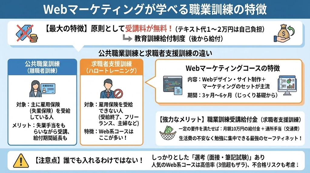 「教育訓練給付制度」がお金を払って後から戻ってくる制度であるのに対し、「職業訓練(ハロートレーニング)」は、原則として受講料が無料である点が最大の特徴です(テキスト代として1〜2万円程度は自己負担となるのが一般的です)。