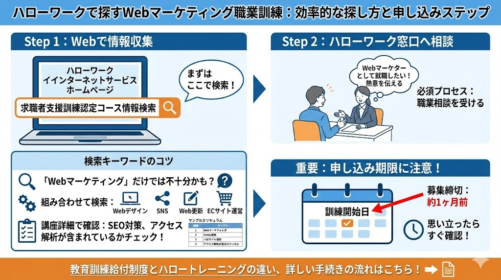 気になる講座が見つかったら、自己判断でWeb申し込みをするのではなく、必ずハローワークの窓口へ相談に行きましょう。「この訓練を受けて、Webマーケターとして就職したいんです」という熱意を伝え、職業相談を受けることが必須プロセスとなります。
