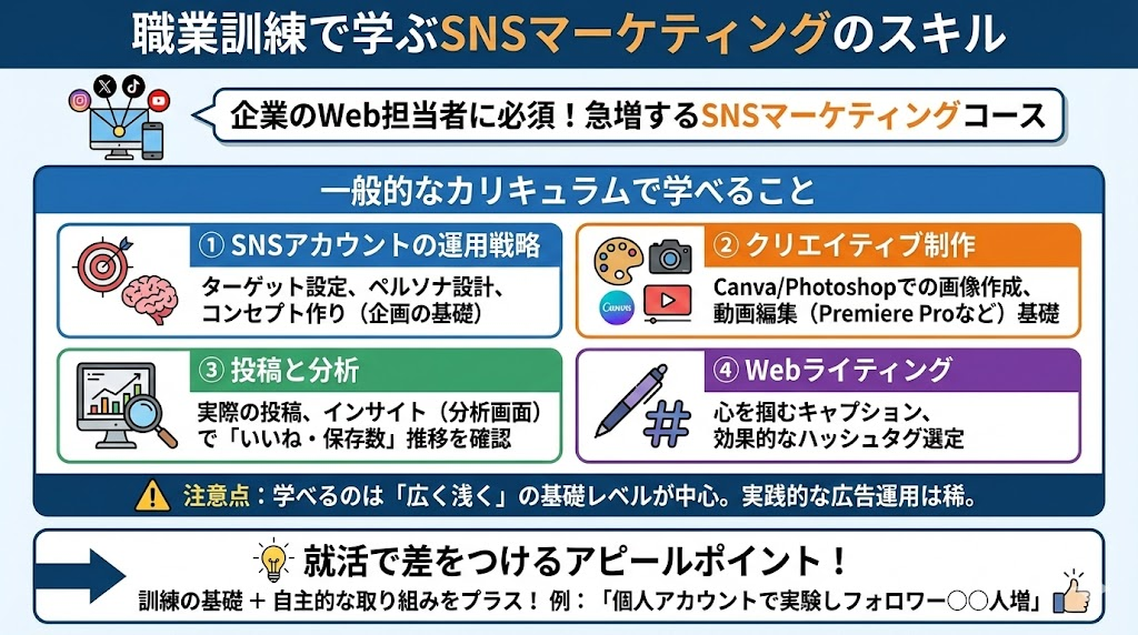 最近の職業訓練では、単なるWebサイト制作だけでなく、InstagramやX(旧Twitter)、TikTok、YouTubeなどを活用したSNSマーケティングをカリキュラムに組み込んでいるコースが急増しています。企業のWeb担当者として、SNS運用はもはや必須スキルになりつつありますからね。