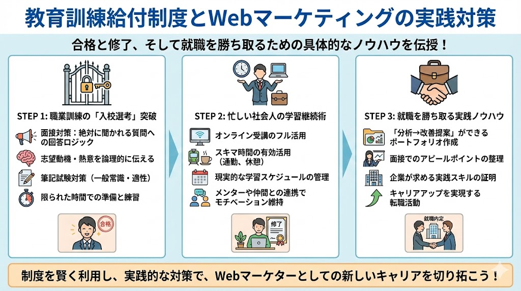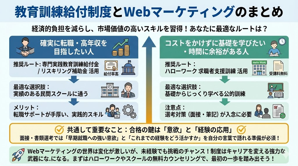 教育訓練給付制度や職業訓練をうまく活用すれば、経済的な負担を大幅に減らしながら、今後の市場価値が高いWebマーケティングスキルを習得することが可能です。最後に、あなた自身の状況に合わせた最適なルートをまとめておきましょう。