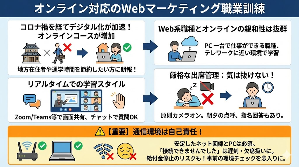 ただし、オンラインだからといって気が抜けるわけではありません。職業訓練の場合、リアルタイムでの出席管理が非常に厳格です。「画面オフで寝ていてもバレない」なんてことはありません。朝の点呼から夕方の終了まで、原則としてカメラオンでの参加が求められ、講師から指名されて回答する場面も多々あります。