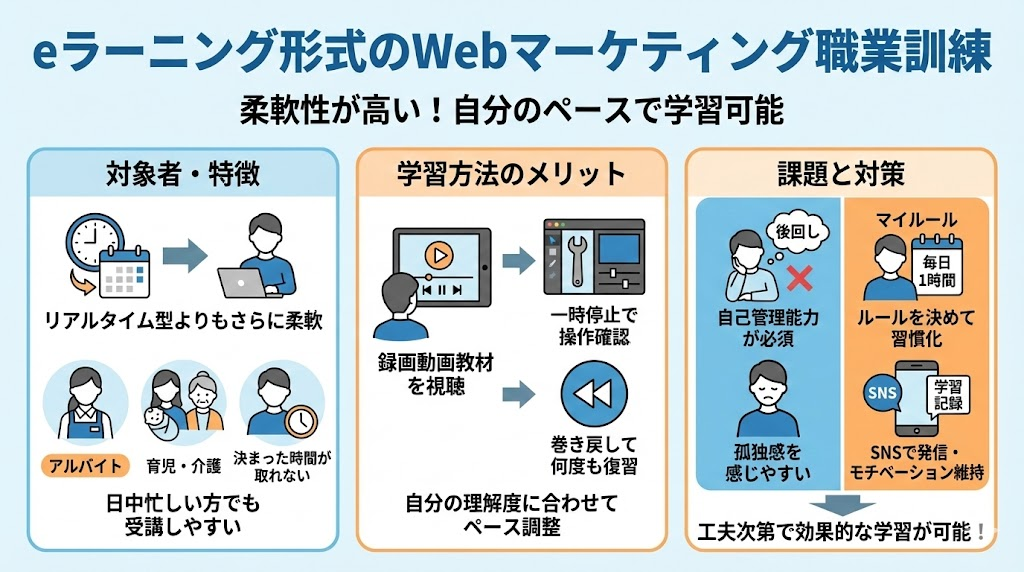 Webマーケティングの学習において、eラーニングは非常に理にかなった学習方法です。ツールの操作画面などは、一度見ただけでは覚えられないことが多いですよね。eラーニングなら、動画を一時停止して操作を確認したり、わからない部分を何度も巻き戻して復習したりと、自分の理解度に合わせてペースを調整できます。