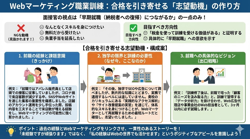 面接官が見ているのは「この人に税金を使って訓練を受けさせれば、確実に早期就職(納税者への復帰)につながるか」という一点のみです。ここを外さない志望動機を作りましょう。