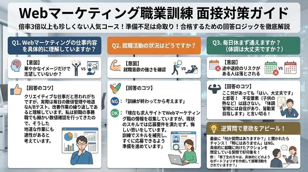 【回答のコツ】:「訓練が終わってから考えます」は絶対にNGです。「現在も求人サイトでWebマーケティング職の情報を収集していますが、現状のスキルでは応募要件を満たせず、悔しい思いをしています。訓練でスキルを補完し、すぐに応募できるよう準備を進めています」と、現在進行形で動いていることを伝えましょう。