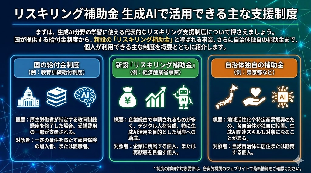 - 生成AI関連のリスキリング講座で活用できる主な支援制度