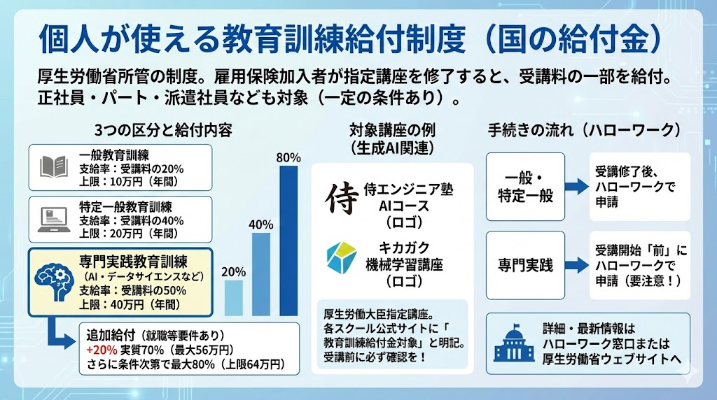 厳密には「補助金」は主に企業向けで公募制のものが多く、「助成金」は条件を満たせば企業や個人が申請できるもの、「給付金」は雇用保険から支給される個人向けのもの――といった違いがあります。しかし本記事では深く区別せず、まとめて「補助金」または「支援制度」として扱いますね。要するに、これらの制度を使えば個人が自己負担を減らして生成AIの講座を受講できるわけです。