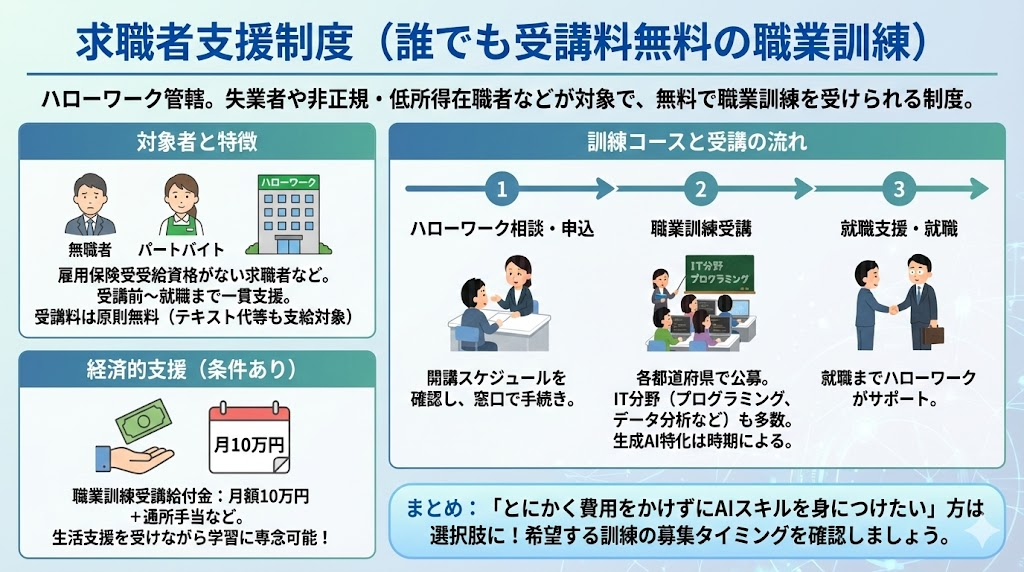 続いて、現在仕事を離れている方向けの支援策として「求職者支援制度」を紹介します。こちらはハローワーク管轄の制度で、簡単に言うと失業中でも無料で職業訓練を受けられるしくみです。訓練期間中は条件を満たせば月10万円の手当(職業訓練受講給付金)を受け取りながら学ぶこともできます。雇用保険の失業手当をもらえない求職者や、非正規で収入が低い在職者などが対象で、受講前〜受講中〜就職までハローワークが一貫支援してくれる心強い制度です。