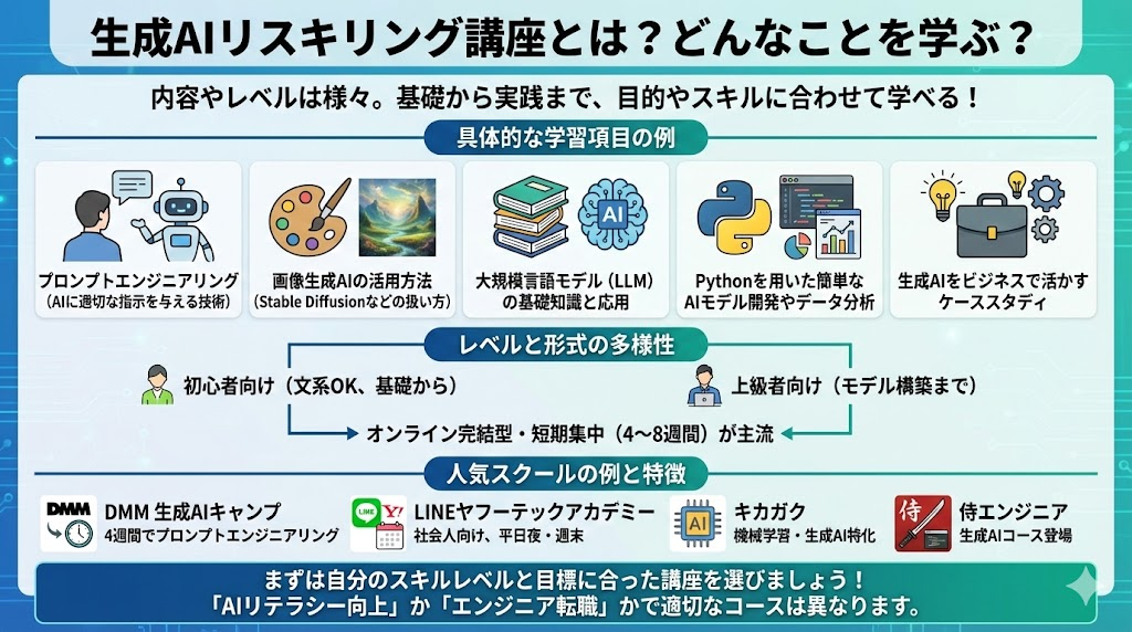ひと口に生成AIの講座といっても、その内容やレベルはさまざまです。一般的な生成AIリスキリング講座では、画像や文章を自動生成するAI技術の仕組みを学んだり、ChatGPTなど生成AIツールの使い方を実践演習したりします。具体的な学習項目の例を挙げると、
