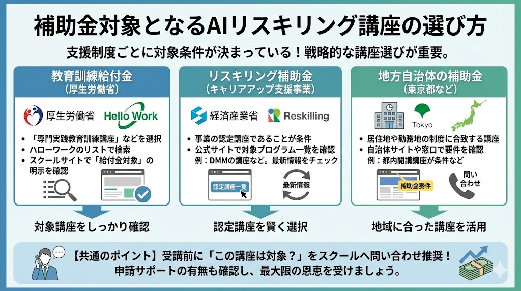 - 補助金対象講座の選び方や制度利用上の注意点