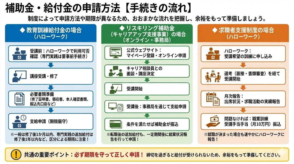 ◆ 教育訓練給付金の場合: 講座の受講前にハローワークで利用可否の確認を行い(※一般教育訓練は不要、専門実践は要事前手続き)、講座修了後に必要書類を添えてハローワークで給付金支給申請をします。具体的な必要書類は、修了証明書、領収書、本人確認書類、振込先口座情報などです。申請期限は修了後1か月以内(一般の場合)や修了後1年以内(専門実践の追加給付)など区分によって異なるので注意しましょう。