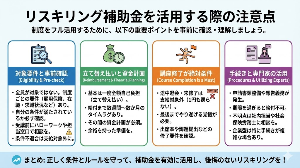 最後に、補助金や給付金を利用する上で覚えておきたい注意点をまとめます。制度をフル活用して後悔のないリスキリングにするために、以下のポイントに気をつけましょう。