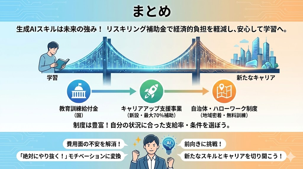大事なのは、補助金に頼るだけでなく自分自身もしっかりコミットすることです。制度を利用することで「絶対に最後までやり抜こう!」というモチベーションにもつながるでしょう。費用面の不安を減らし、ぜひ前向きに生成AIリスキリングに挑戦してみてください。学び直しを支援してくれる制度をフル活用して、新たなスキルとキャリアを切り開いていきましょう!